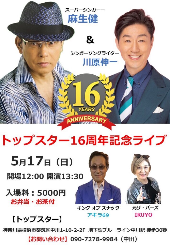 2026年4月7日 / 最終更新日時 : 2026年4月7日 akiko イベント情報 5月17日トップスター16周年記念イベント トップスターの16周年記念イベントが開催されます。 5月17日12時開場、13時半開演、お茶とお弁当付き。 お問い合わせは 090-7278-9984 まで。 または直接お店に行って予約ください! FacebookXBlueskyPocketCopy